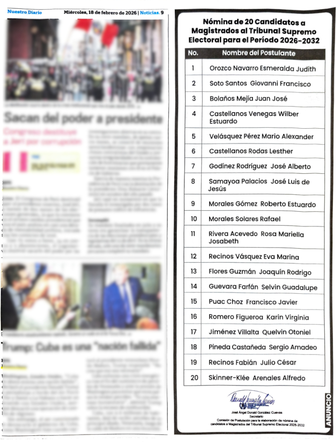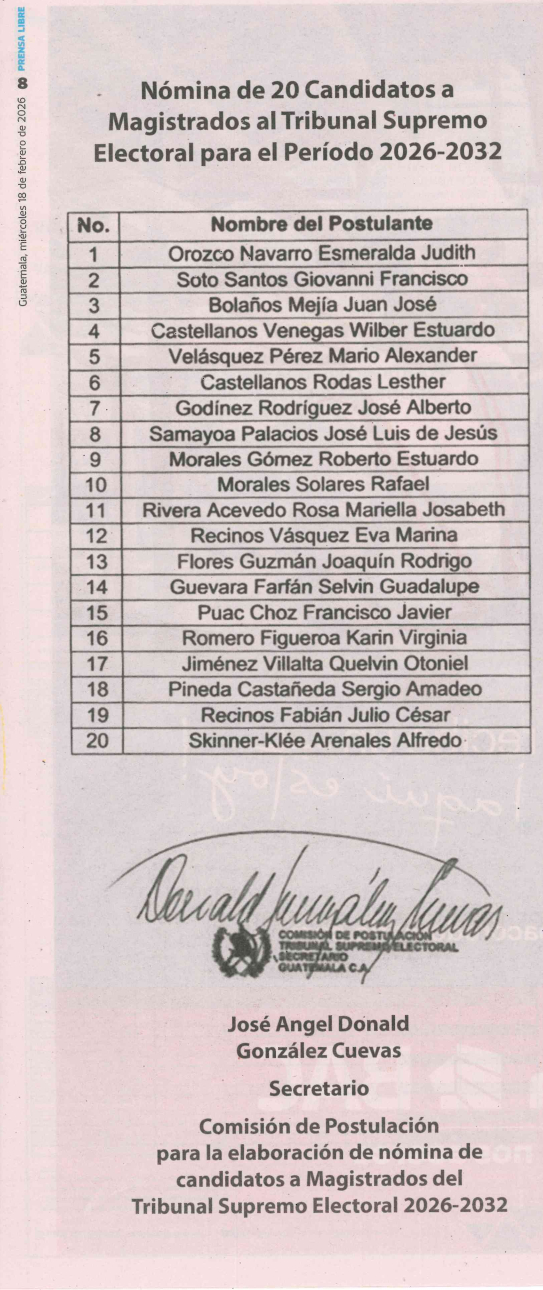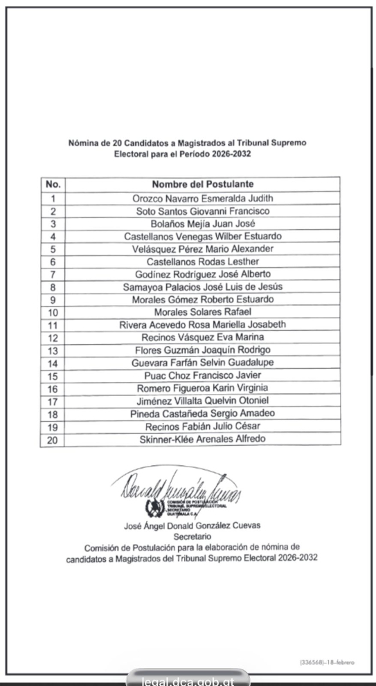 Nómina de 20 Candidatos a Magistrados del Tribunal Supremo Electoral para el período 2026-2032